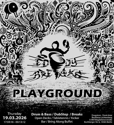 Thursday 19.03.2026 18:00 Drugstore im Rockhaus (Buchberger Straße 6, 10365 Berlin - Lichtenberg) Breakbeat/BigBeat Drum&Bass Garage/Grime/Dubstep HipHop/Rap/Trap IDM/Glitch/Breakcore Jungle
